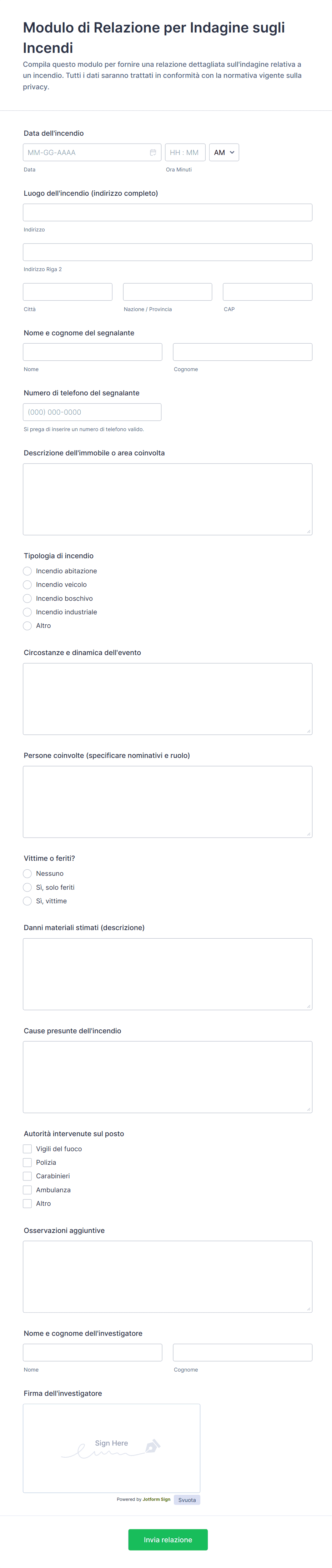 Raccogli online le segnalazioni di incidenti grazie ai moduli gratuiti Jotform per la Segnalazione degli Incidenti. Che sia per utilizzo aziendale interno, per rapporti di primo soccorso o segnalazioni di incendi, scegli uno dei nostri template già pronti e personalizzalo in pochi secondi con il nostro costruttore drag-and-drop. Condividi il tuo modulo con un link o integralo sul tuo portale aziendale interno per un facile accesso. I nostri template sono perfetti per essere compilati da qualsiasi smartphone, tablet o computer.