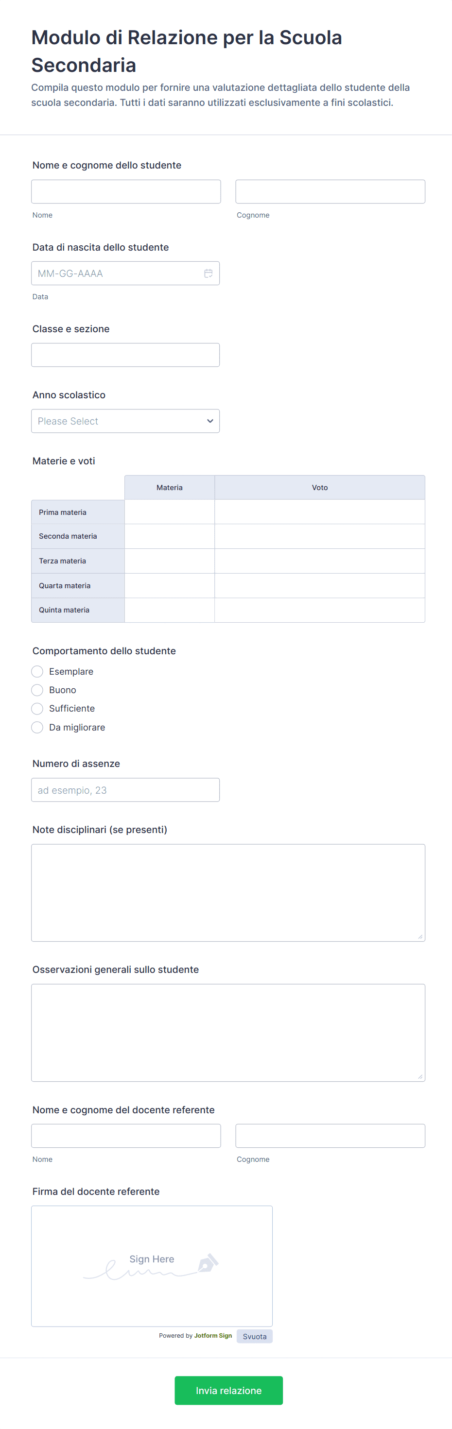 Raccogli valutazioni, assenze e osservazioni degli studenti con il Modulo di Relazione per la Scuola Secondaria, ideale per docenti e segreterie che vogliono semplificare la raccolta dati e la gestione delle risposte.