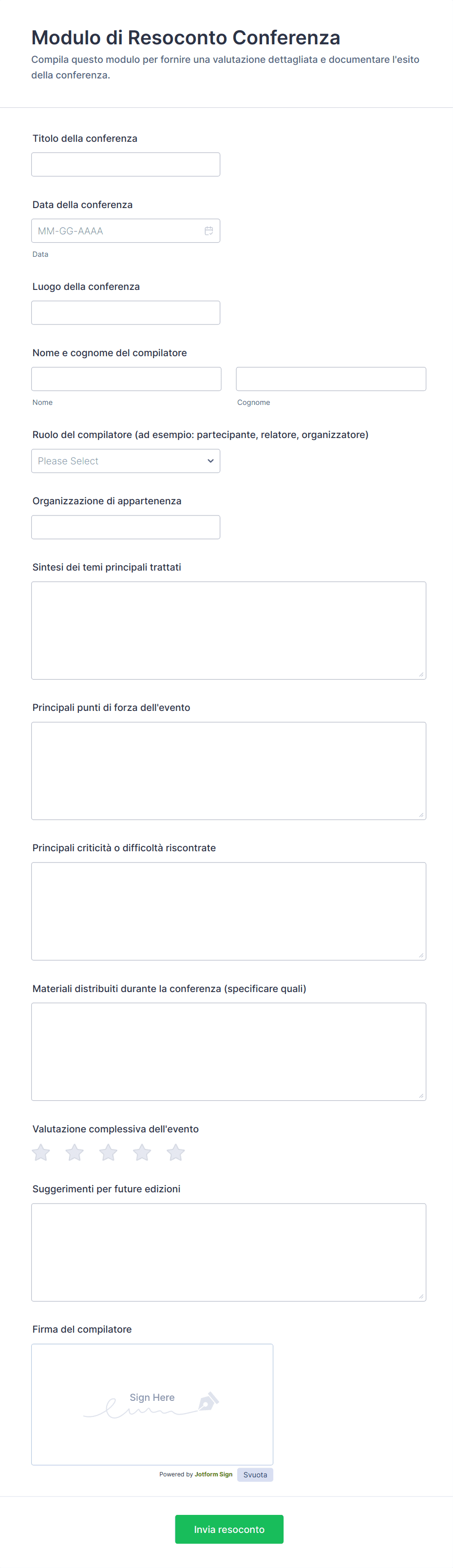 Con Jotform, gli utenti possono facilmente sfruttare i modelli di report per semplificare e automatizzare i loro flussi di lavoro. Il costruttore di moduli Jotform, intuitivo e con funzionalità trascina e rilascia, consente a chiunque di personalizzare i modelli di report senza alcuna conoscenza di programmazione, rendendolo accessibile per utenti di tutti i livelli. Sfruttando la vasta libreria di modelli già pronti all'uso, gli utenti possono rapidamente adattare i moduli alle loro specifiche esigenze, integrarsi con altri strumenti e gestire le risposte in modo efficiente. Che tu abbia bisogno di raccogliere feedback, monitorare statistiche o generare resoconti dettagliati, i modelli di report Jotform ti aiutano a risparmiare tempo, ridurre gli errori e garantire che i tuoi dati siano utili e organizzati.