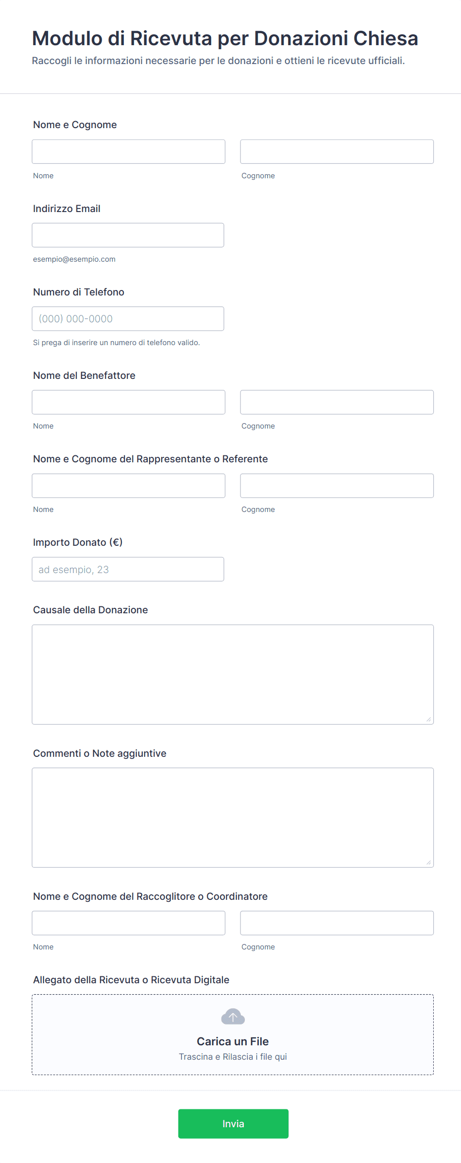 • Moduli per Donazioni Generiche: si concentrano sui dati del donatore, sull'importo della donazione e sul metodo di pagamento.