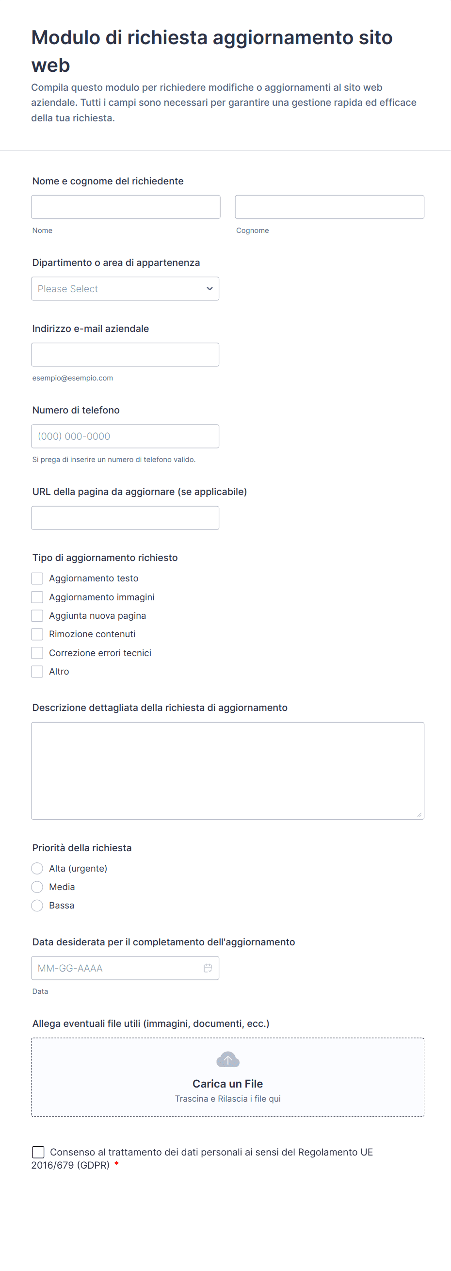 Campi comuni includono il nome del richiedente, i dettagli di contatto, il dipartimento, il tipo di richiesta, la descrizione dettagliata, l'urgenza e eventuali allegati pertinenti.