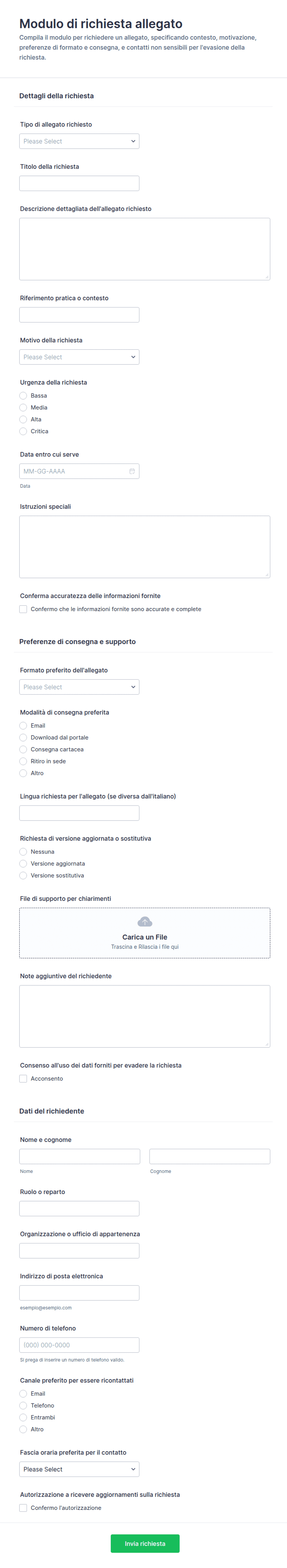 • Moduli di Richiesta di Supporto: Combina il caricamento di file con campi per la descrizione dettagliata del problema e le informazioni di contatto.