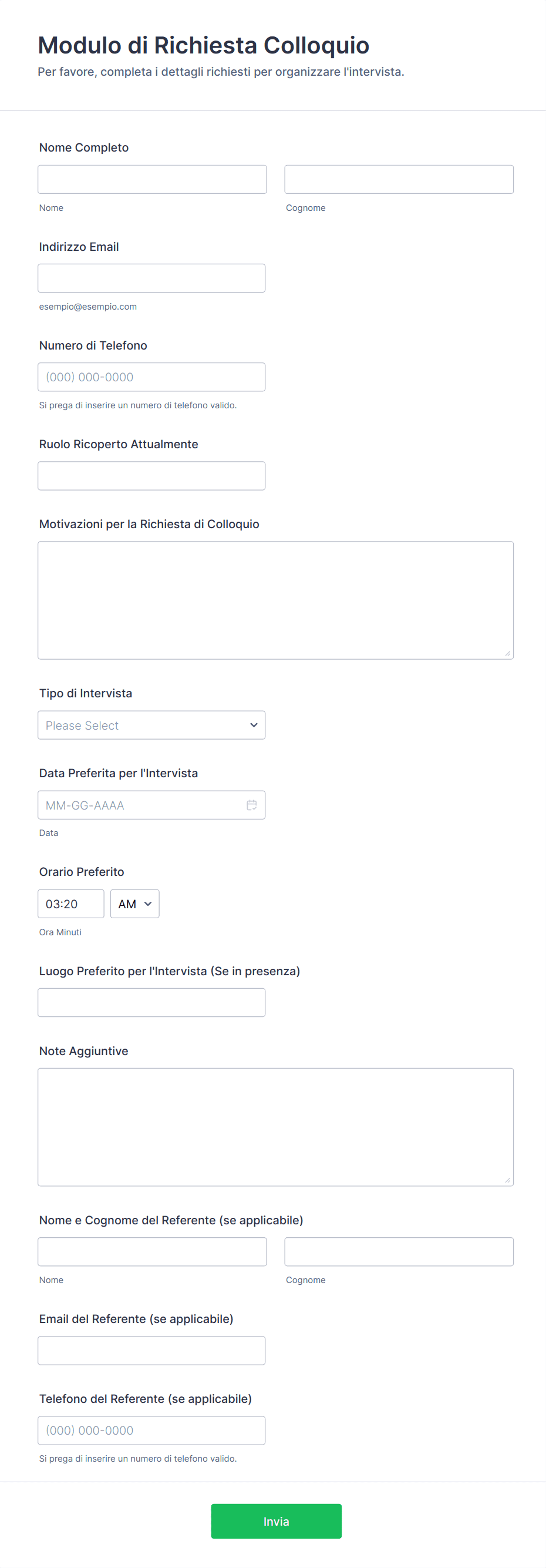 - La scelta dei tipi di domande, i campi obbligatori e la logica condizionale varieranno in base allo scopo del colloquio.