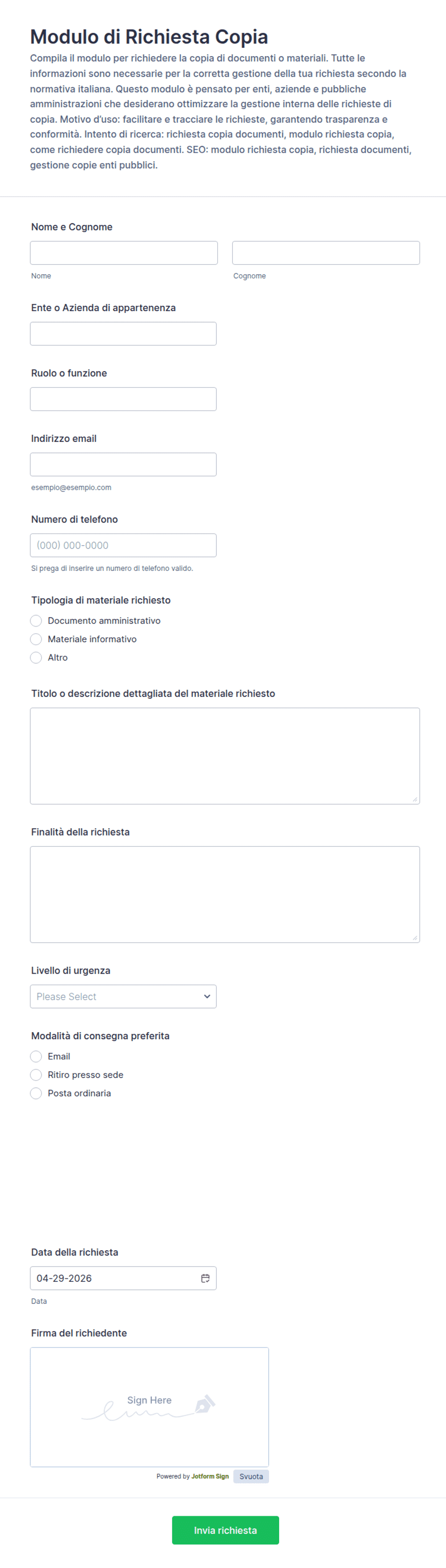 Un modulo di richiesta è un documento strutturato o un modulo online utilizzato per raccogliere informazioni da persone che necessitano di richiedere un servizio, una risorsa, un'approvazione o un supporto. Standardizza il modo in cui le richieste vengono presentate e gestite.