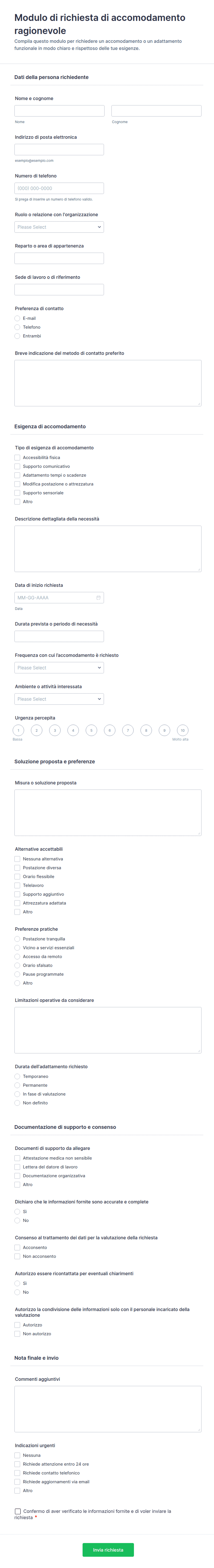 Campi comuni includono dettagli dell'utente, tipo di modifica, motivo della richiesta, date rilevanti e documentazione di supporto.