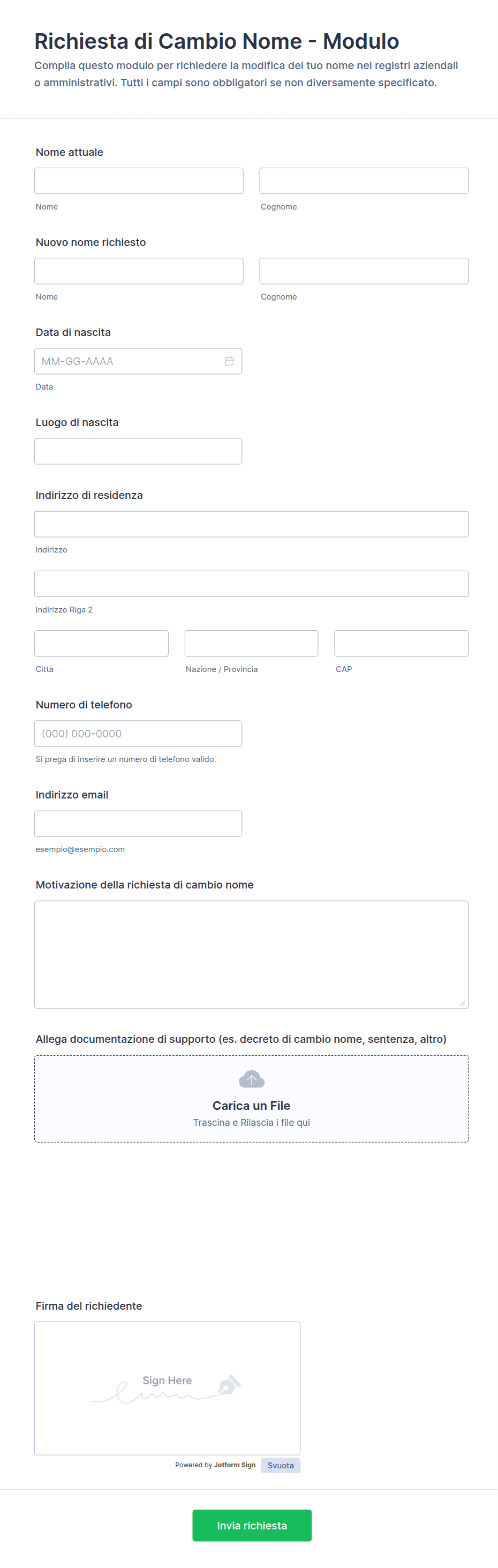 I modelli di modulo qui riportati hanno solo scopo informativo. Jotform non fornisce consulenza legale, finanziaria o di altro tipo, né implica che i moduli siano legalmente validi in tutte o in alcune giurisdizioni. Prima di utilizzare tali moduli, consultare un legale e/o altri professionisti competenti per assicurarsi che il modulo soddisfi le proprie esigenze, sia dal punto di vista legale che di altro tipo.