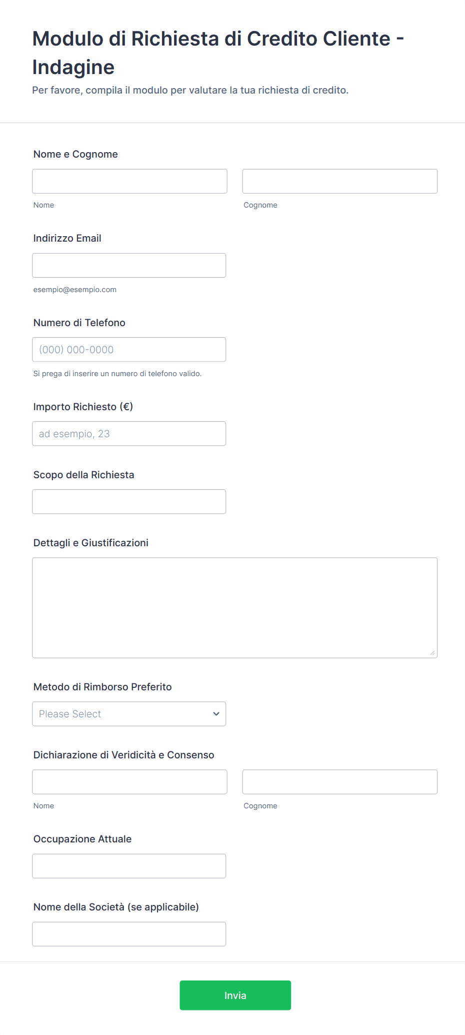 • Richieste di credito aziendale: le aziende richiedono linee di credito o credito commerciale, spesso necessitando di dati finanziari e referenze aziendali.