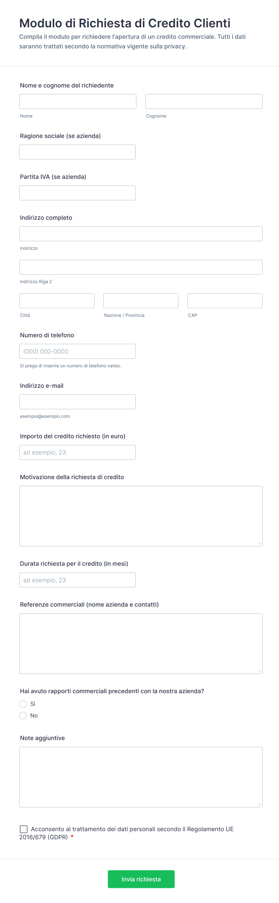 - Richieste di credito aziendale: le aziende richiedono linee di credito o credito commerciale, spesso necessitando di dati finanziari e referenze aziendali.