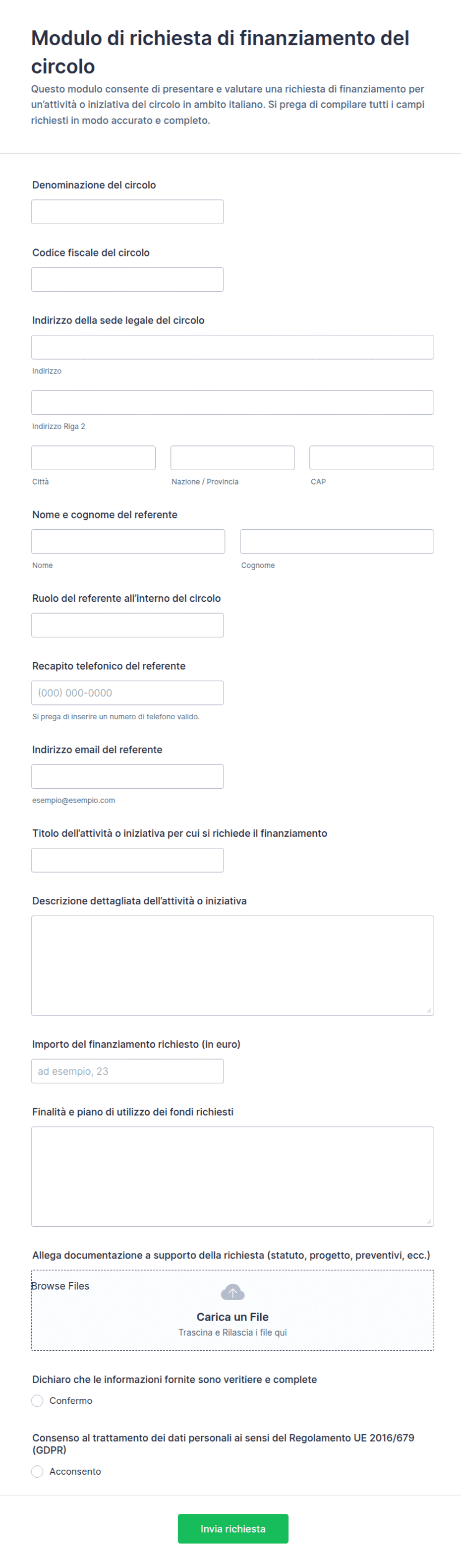 Un Modulo di Richiesta Finanziamento viene utilizzato dagli istituti di credito per decidere se offrire un prestito ad una persona che richiede un finanziamento da un istituto finanziario. Utilizza questo modulo per raccogliere le informazioni necessarie riguardo i richiedenti al fine di decidere se garantire o no il prestito. È sufficiente personalizzare i campi per includere tutte le informazioni necessarie che rimarranno disponibili per essere consultate in un secondo momento. Una volta creato il modulo, è possibile condividerlo con un link o incorporarlo nel proprio sito web. Sara' sufficiente sincronizzarsi con il servizio di archiviazione prescelto per visualizzare tutti gli invii attraverso un'unica piattaforma. Per gli utenti più esperti, è possibile integrare il modulo con Google Drive, Dropbox, Box o con un processore di pagamento di terze parti come Stripe o PayPal, per sfruttare al meglio le informazioni raccolte. Personalizza il tuo Modulo di Richiesta Finanziamento utilizzando questo modello gratuito di Jotform!