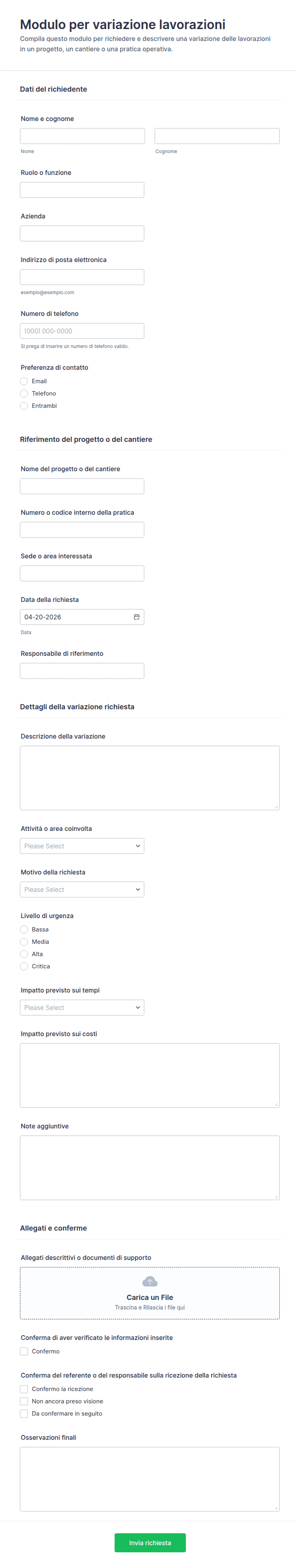 - Campi di caricamento file per documenti di supporto (ad esempio, piani rivisti, preventivi)