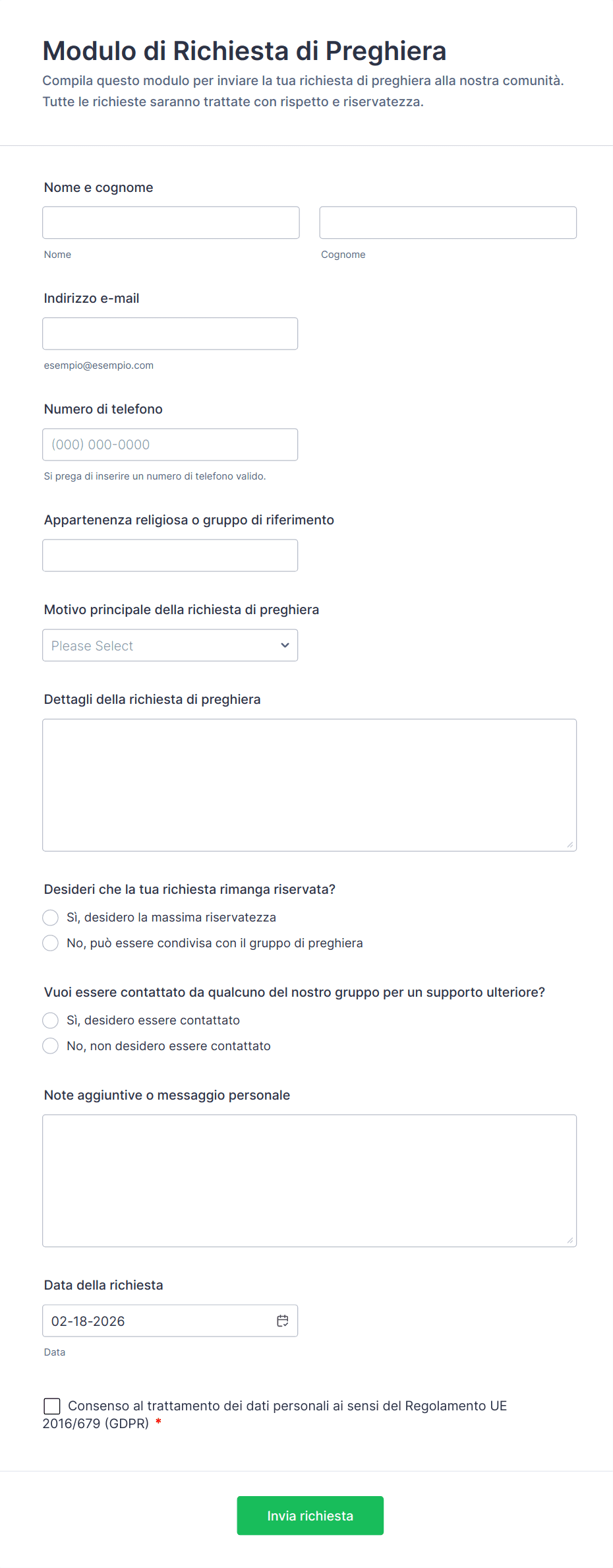 Un modello di modulo per le chiese è un modulo online già pronto, che aiuta le chiese a raccogliere e gestire informazioni per varie attività, come registrazioni agli eventi, donazioni, iscrizioni di volontari e richieste di preghiere.