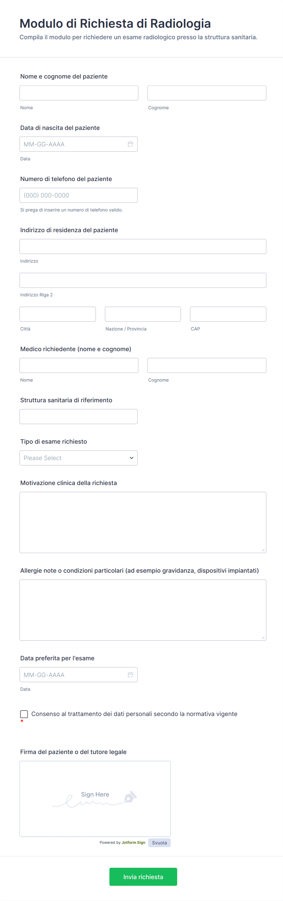 Raccogli richieste di esami radiologici da pazienti e medici con il Modulo di Richiesta di Radiologia, ideale per strutture sanitarie che vogliono organizzare la data collection e gestire le risposta in modo coerente.
