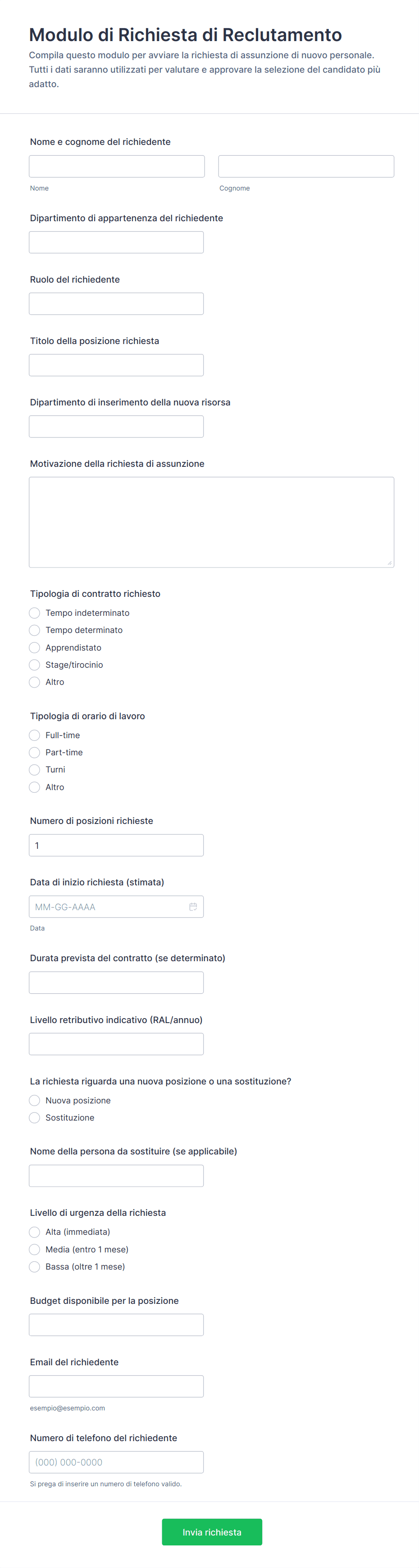Gestisci le richieste interne di nuove assunzioni con il Modulo di richiesta di assunzione di Jotform, utile a reparti e responsabili per raccogliere dati, definire priorità e velocizzare le approvazioni.
