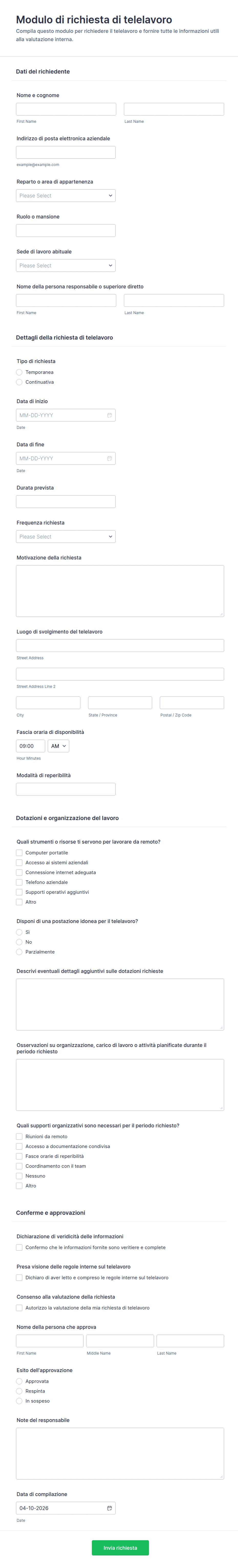 - Dettagli sul telelavoro: Date, luogo di lavoro, motivo della richiesta.