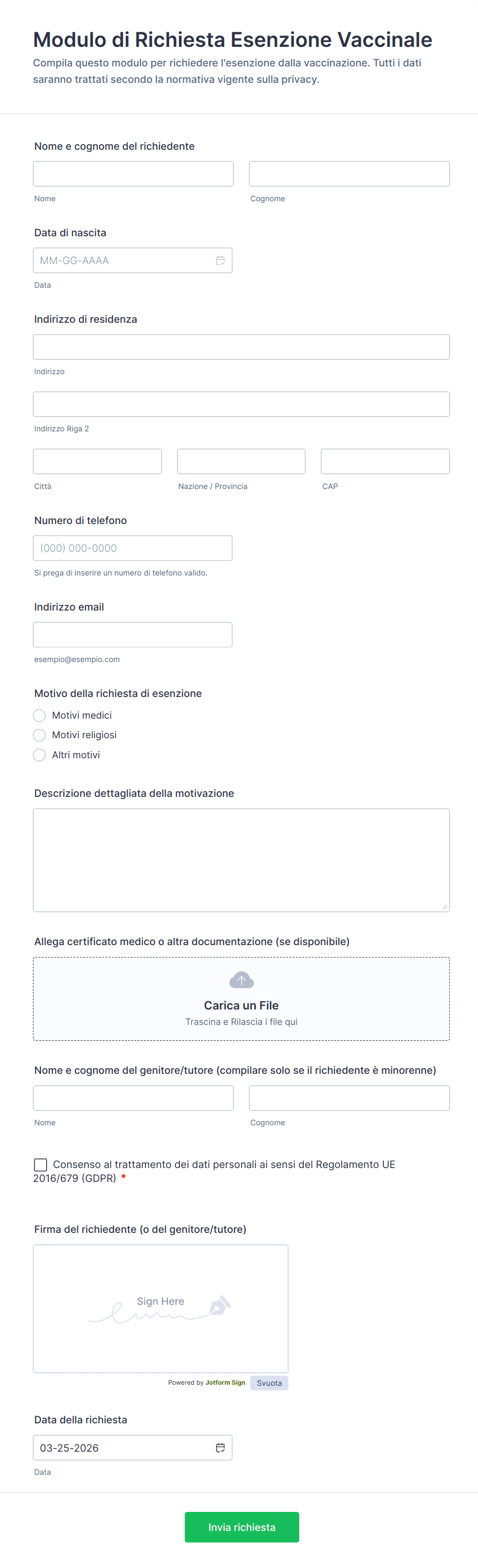 I modelli di modulo qui riportati hanno solo scopo informativo. Jotform non fornisce consulenza legale, finanziaria o di altro tipo, né implica che i moduli siano legalmente validi in tutte o in alcune giurisdizioni. Prima di utilizzare tali moduli, consultare un legale e/o altri professionisti competenti per assicurarsi che il modulo soddisfi le proprie esigenze, sia dal punto di vista legale che di altro tipo.