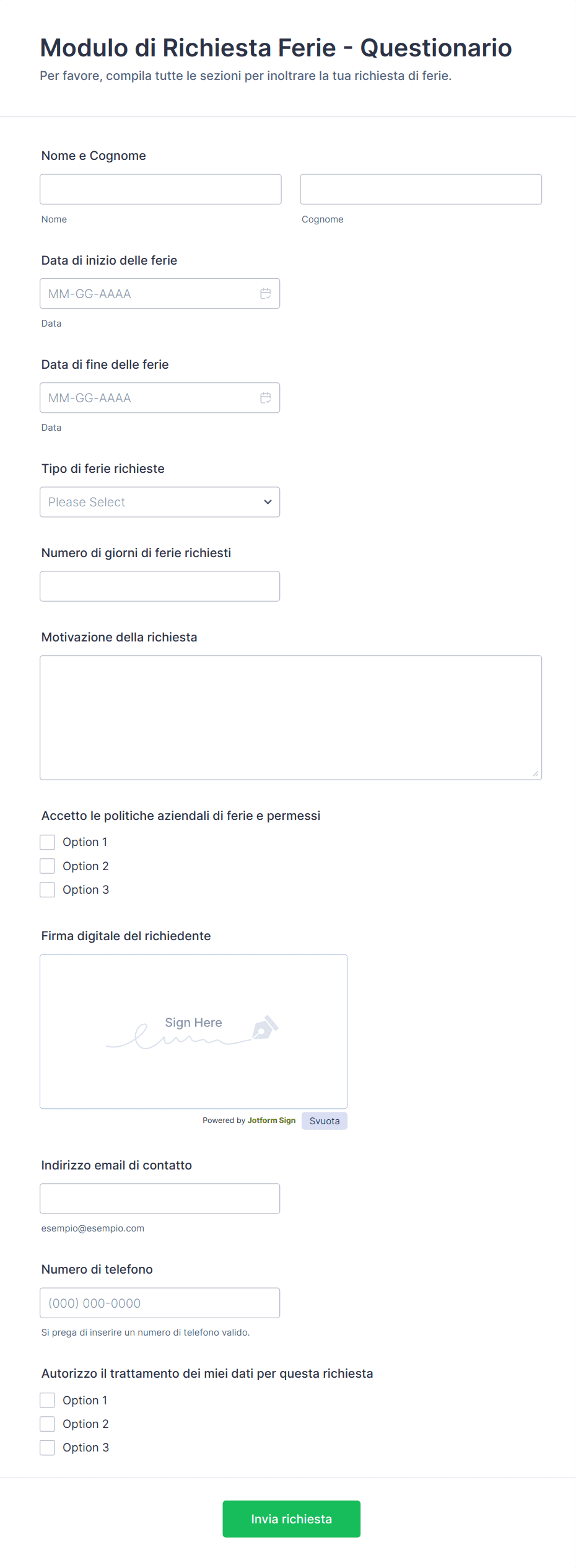 - Richieste di Lavoro da Remoto: Potrebbero includere caselle di controllo per le esigenze di attrezzature o le politiche di lavoro da remoto.