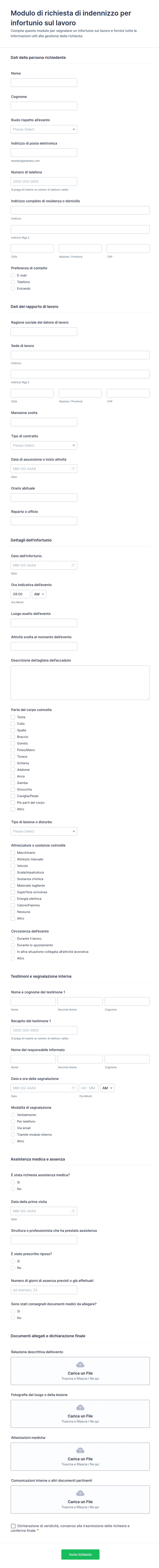 - Reclami assicurativi: Richiedono campi per le descrizioni dettagliate degli incidenti, numeri di polizza e documenti di supporto (ad es. foto, rapporti della polizia).