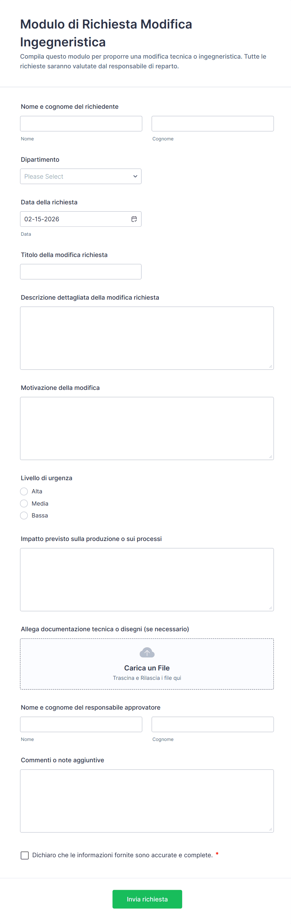 - Campi di caricamento file per documenti di supporto (ad esempio, piani rivisti, preventivi)