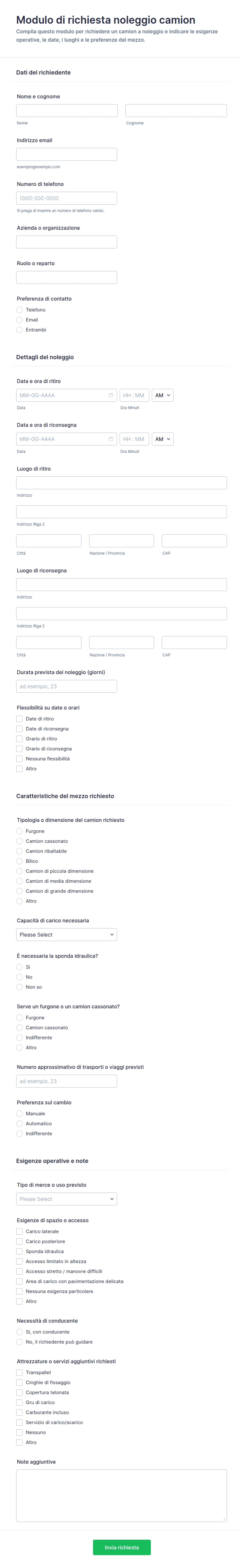 Campi comuni includono i dettagli del passeggero o del richiedente, le località di ritiro e consegna, le date e gli orari, le preferenze del veicolo ed eventuali requisiti speciali.