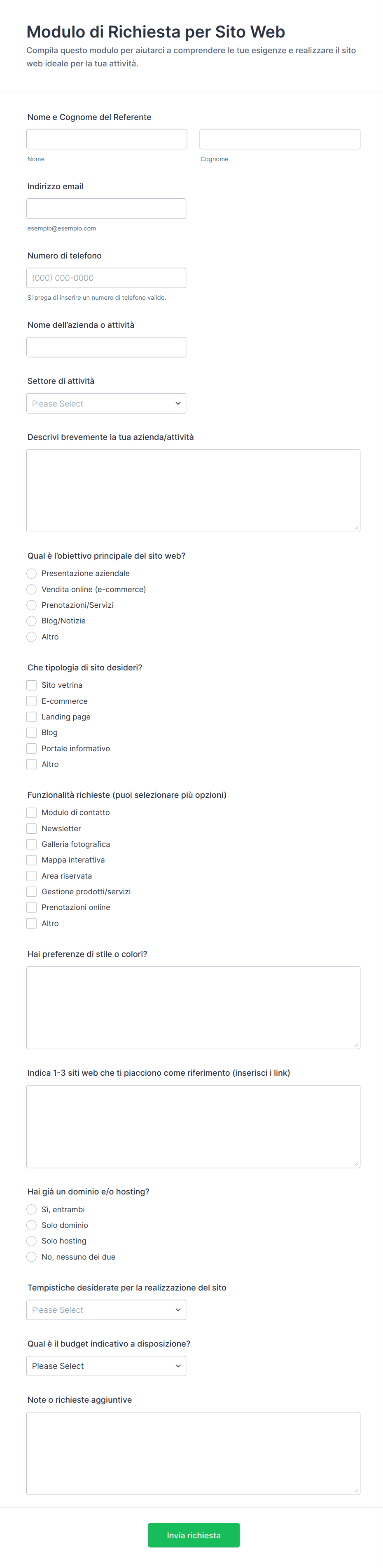 Un modulo per web design è un modulo online utilizzato da web designer e agenzie per raccogliere informazioni dai clienti, gestire richieste di progetti, raccogliere feedback o gestire richieste di supporto relative a progetti di siti web.