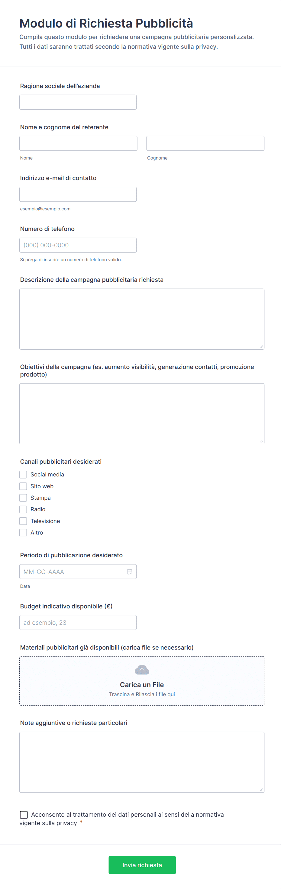 I moduli pubblicitari aiutano a standardizzare la raccolta dati, ridurre gli errori manuali, accelerare i processi di approvazione e garantire una comunicazione chiara tra clienti, team creativi, e acquirenti media.