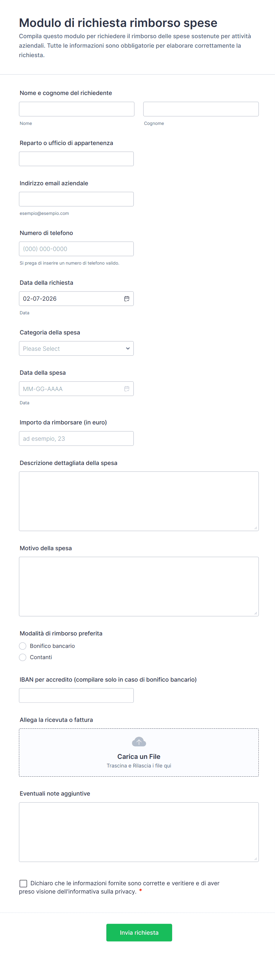 - Per i rimborsi di viaggio, includi campi per le date del viaggio, le destinazioni e i dettagli del trasporto.