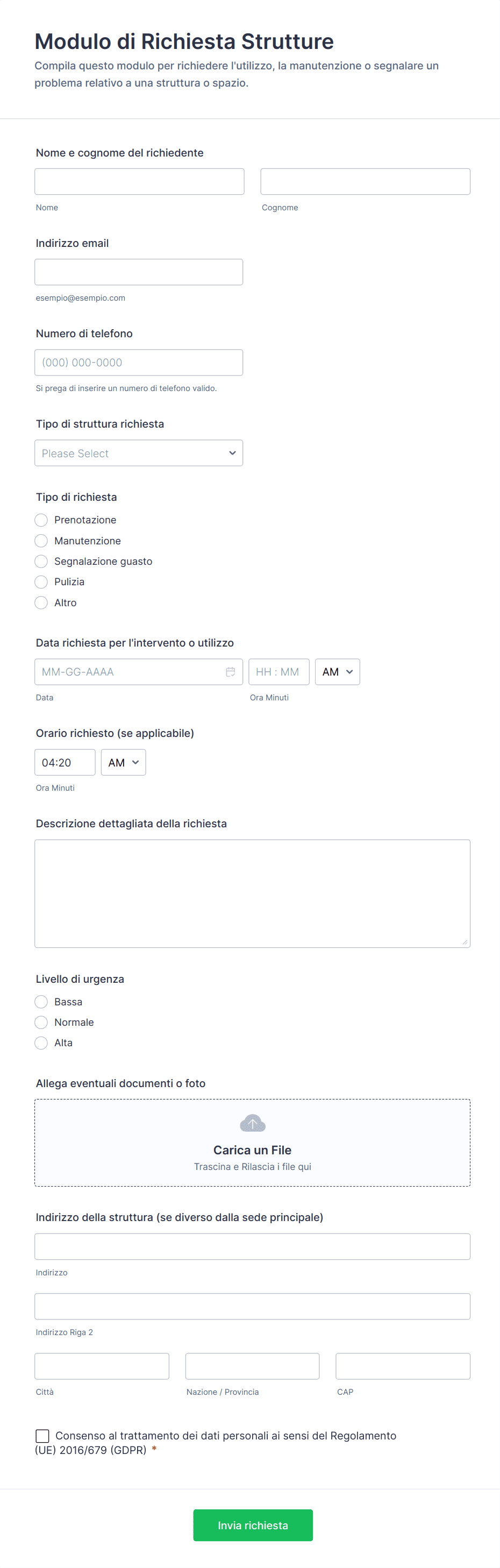 Facility management forms are structured documents used to manage and document facility operations such as maintenance, inspections, space requests, and service coordination. They help organizations collect consistent information about building issues, work orders, safety checks, vendor visits, and operational needs so facilities can run smoothly and safely. Facility management forms are commonly used in offices, campuses, hospitals, hotels, retail locations, warehouses, and industrial sites. Typical workflows include maintenance requests, preventive inspection checklists, cleaning schedules, access requests, and incident reporting. By standardizing these processes, facility management forms reduce delays, improve accountability, and create clear records for follow-up and compliance.