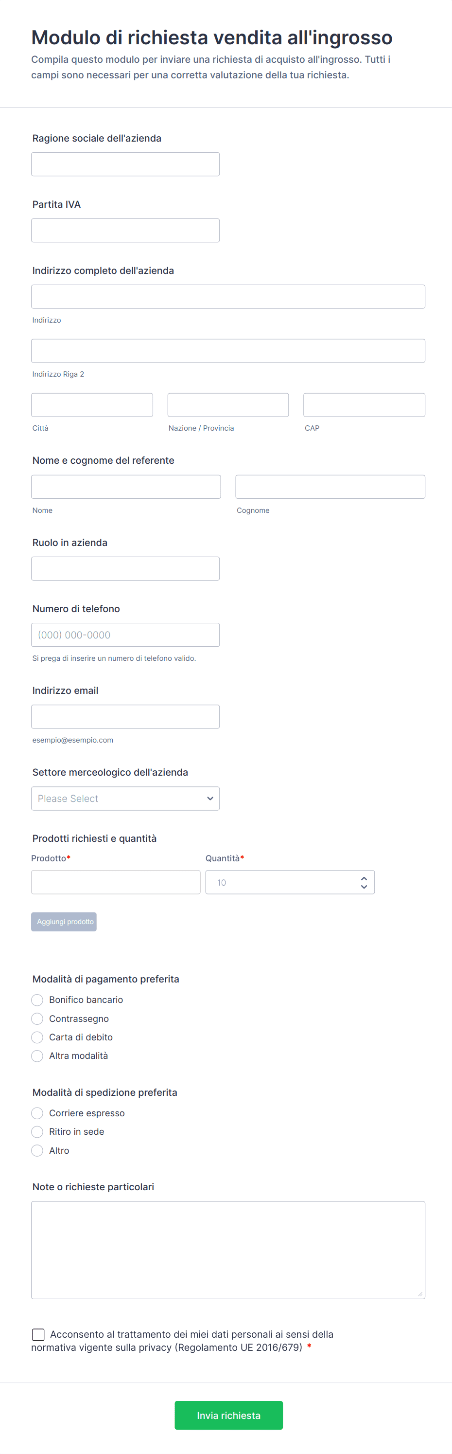 - Ordini all'ingrosso: i moduli possono consentire l'inserimento di quantità all'ingrosso, prezzi su livelli, e campi relativi agli account aziendali.