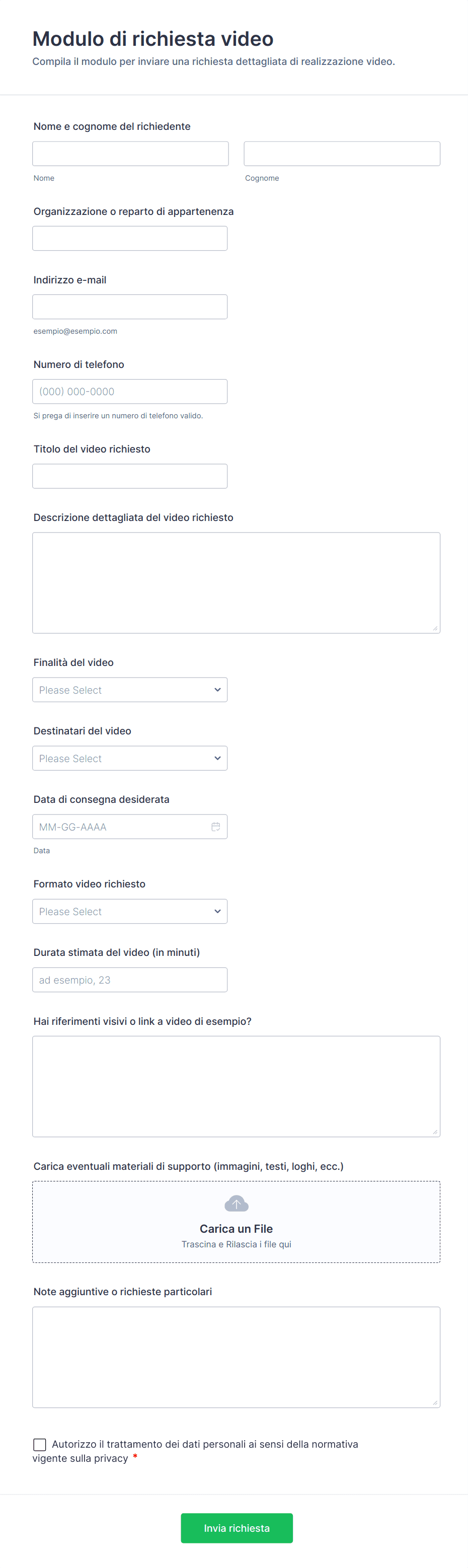 In genere conviene includere i contatti del richiedente, l’obiettivo del video, i destinatari e una scadenza, oltre alla possibilità di caricare file con materiali di supporto utili alla produzione.