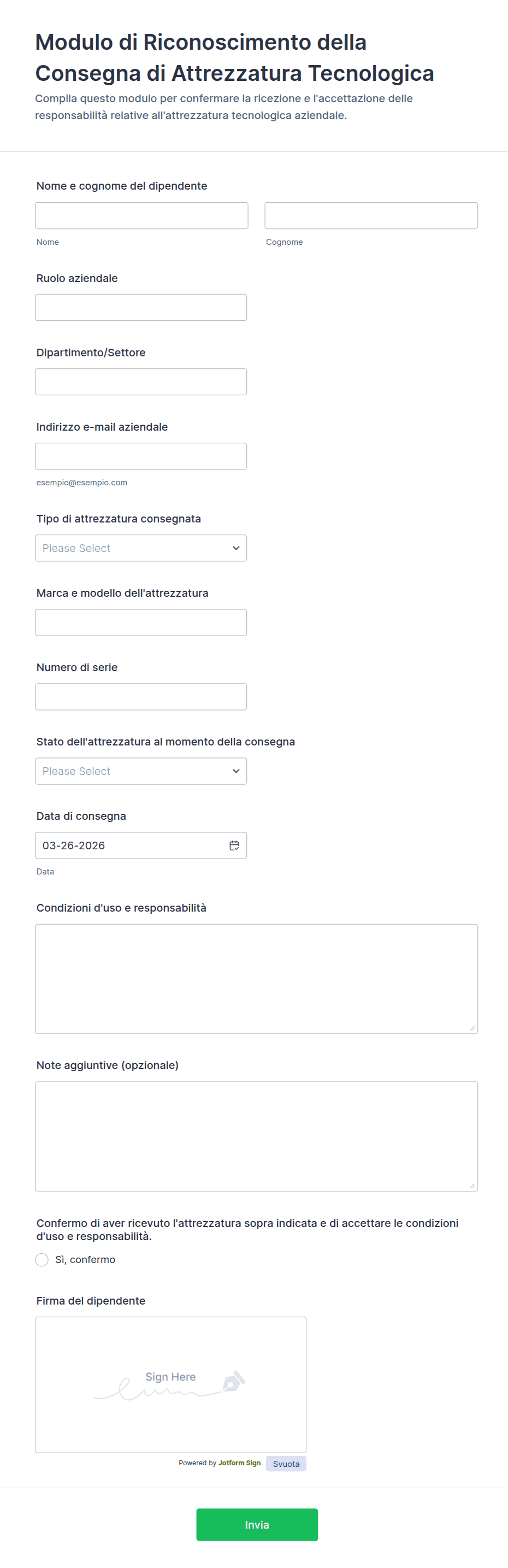 Gestisci la consegna di dispositivi aziendali con il Modulo di Riconoscimento della Consegna di Attrezzatura Tecnologica, utile per reparti informatici e amministrazione per confermare assegnazioni e archiviare ogni invio del modulo.
