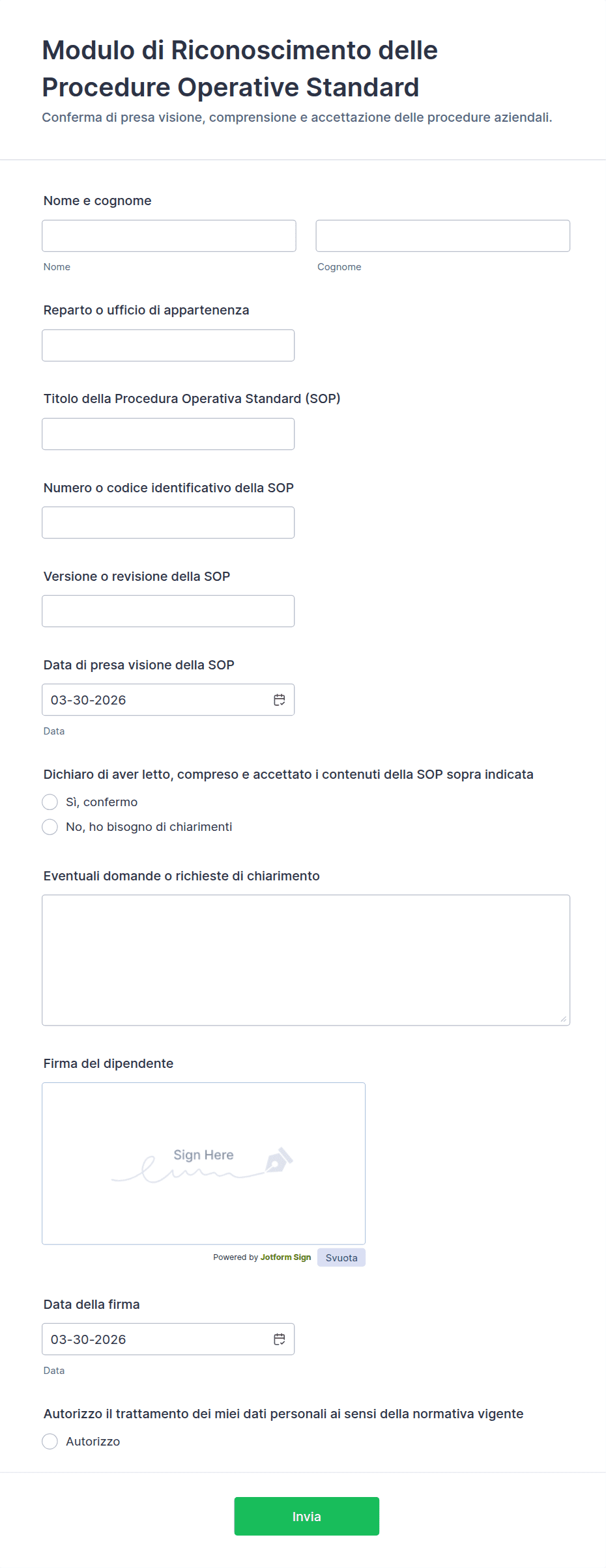 Jotform utilizza misure di sicurezza standard del settore, inclusa la crittografia e l'archiviazione sicura dei dati, per proteggere le informazioni sensibili inviate tramite i moduli di approvazione. L'accesso può essere limitato solo agli utenti autorizzati.