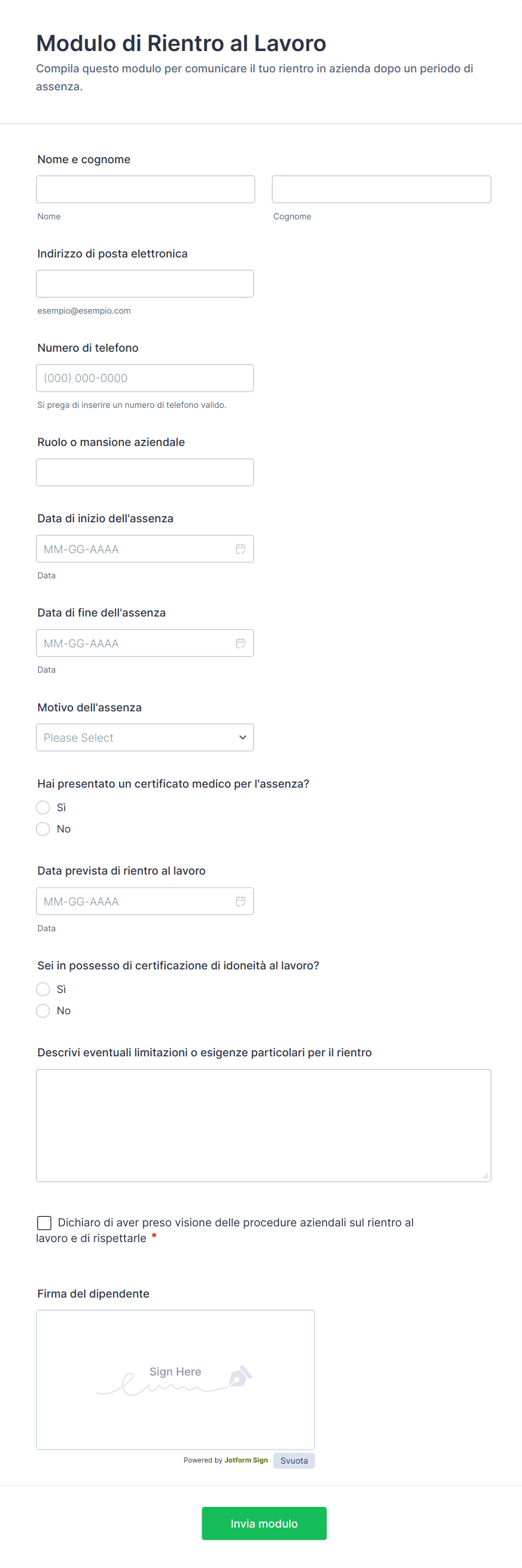 Seguendo questi passaggi, è possibile creare un Modulo di Rientro al Lavoro che soddisfi le esigenze specifiche della vostra organizzazione, semplifichi il processo di rientro e garantisca che tutte le informazioni necessarie siano raccolte in modo sicuro ed efficiente.