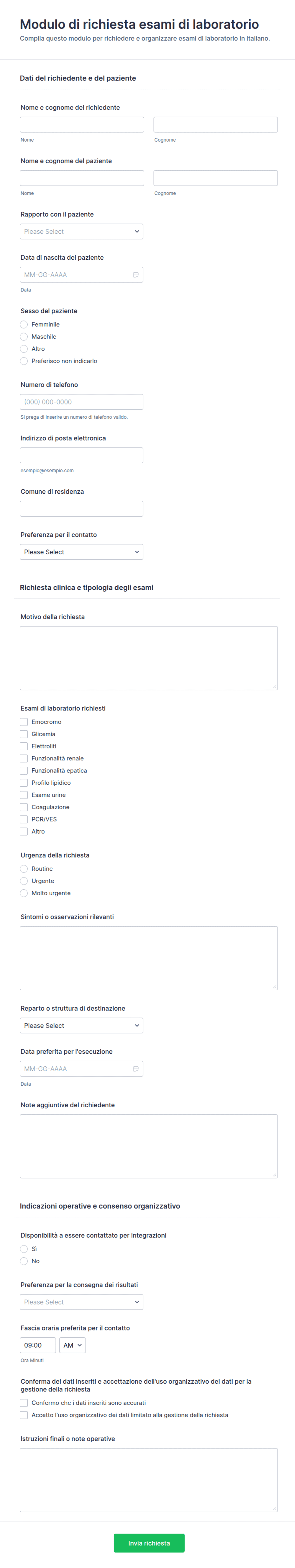 La logica condizionale può mostrare sezioni diverse per diversi tipi di test o categorie, e campi aggiuntivi per casi urgenti o normativi. Ad esempio, se è selezionato "Clinico", mostra il codice del paziente o i campi di approvazione richiesti (a seconda dei casi). Se è selezionato "Urgente", mostra i campi di escalation e notifica.