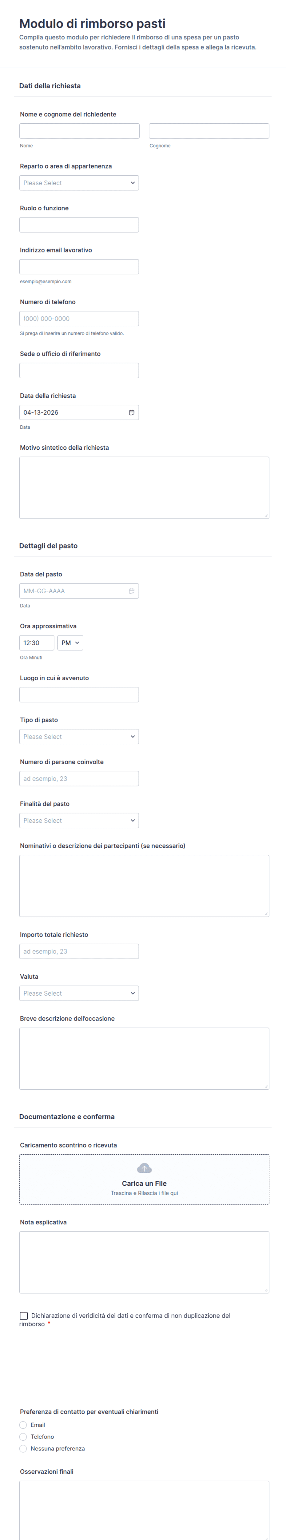 - Per i rimborsi di viaggio, includi campi per le date del viaggio, le destinazioni e i dettagli del trasporto.