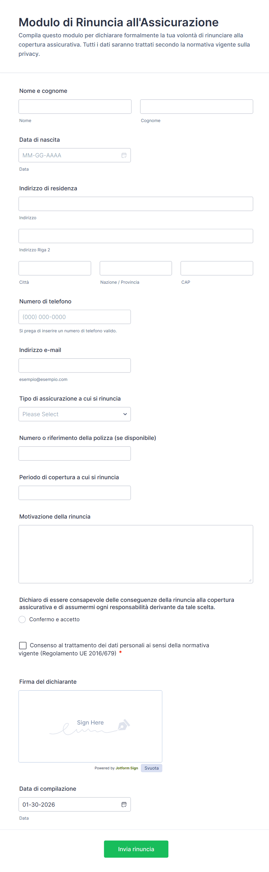 Certamente. I moduli possono essere personalizzati per assicurazioni sanitarie, auto, immobiliari, vita, viaggio e altri tipi di assicurazioni, aggiungendo o modificando i campi per soddisfare requisiti specifici.