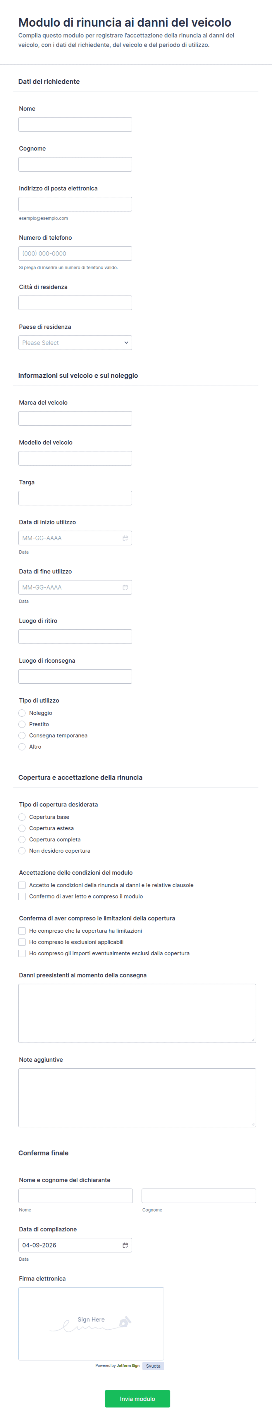 Campi comuni includono i dettagli di contatto del cliente, le informazioni sul veicolo (marca, modello, anno, numero di telaio), i dettagli del servizio o del noleggio, le informazioni sul pagamento e le firme digitali.