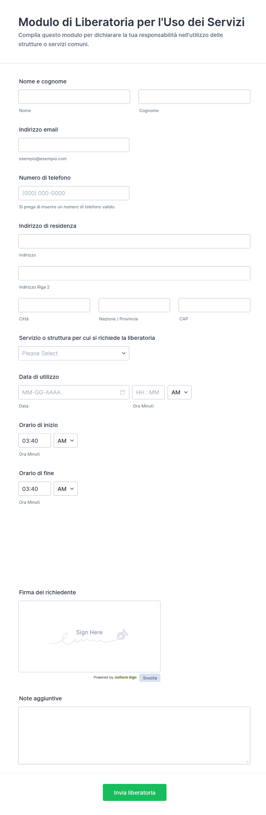3. Quali informazioni andrebbero incluse in un modulo di liberatoria per i servizi?