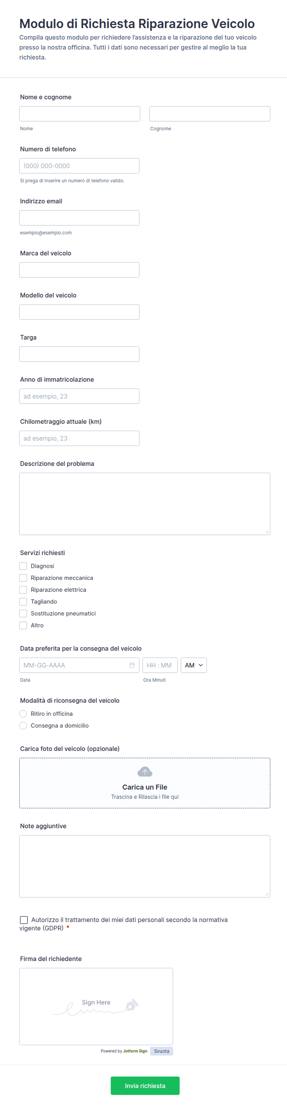 Campi comuni includono i dettagli di contatto del cliente, le informazioni sul veicolo (marca, modello, anno, numero di telaio), i dettagli del servizio o del noleggio, le informazioni sul pagamento e le firme digitali.