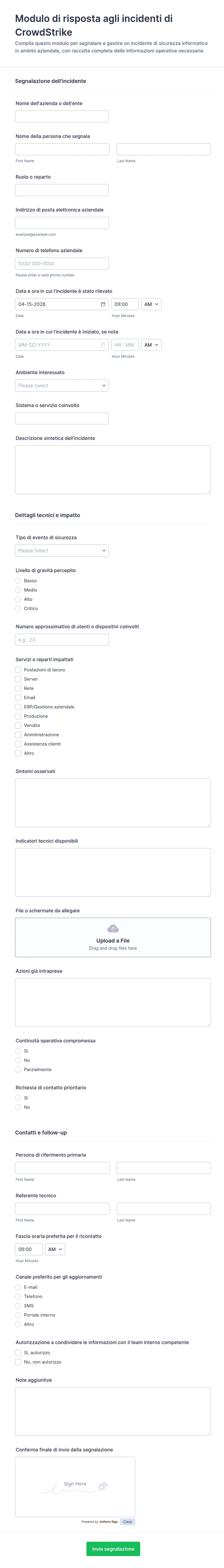 Registra e centralizza le segnalazioni di incidenti informatici con il Modulo di segnalazione di attacco informatico, utile per aziende ed enti che vogliono migliorare la raccolta dati e la gestione delle risposte in Jotform.