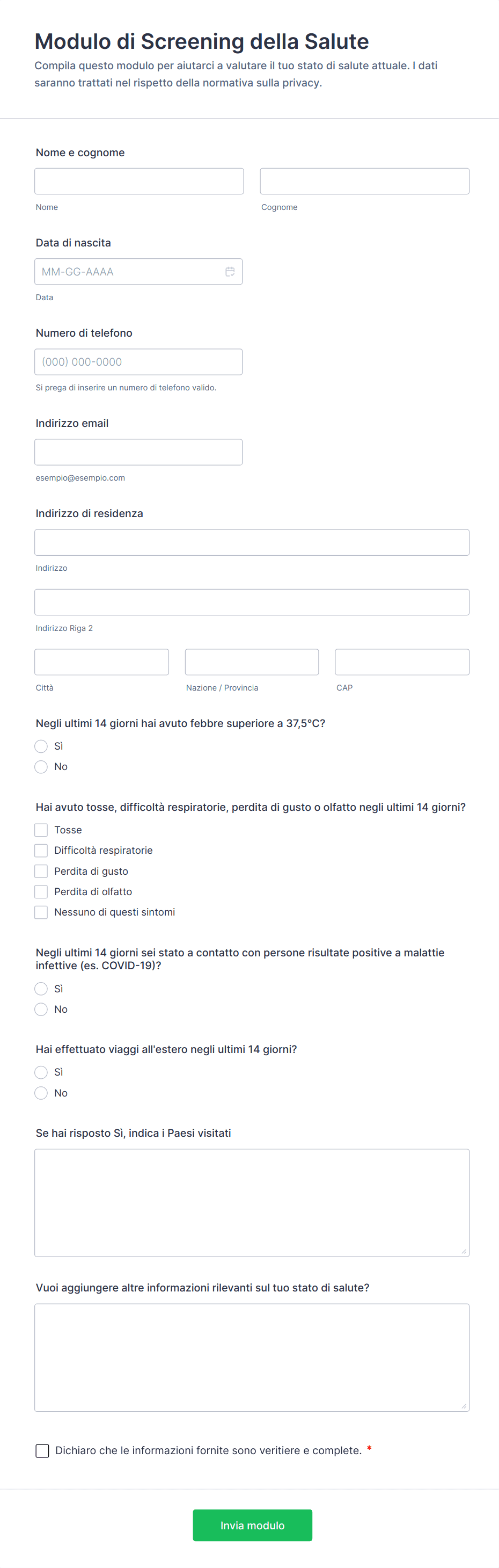 - Per le valutazioni del rischio per la salute, includi caselle di controllo o domande a scelta multipla su stile di vita, storia familiare e fattori di rischio specifici.
