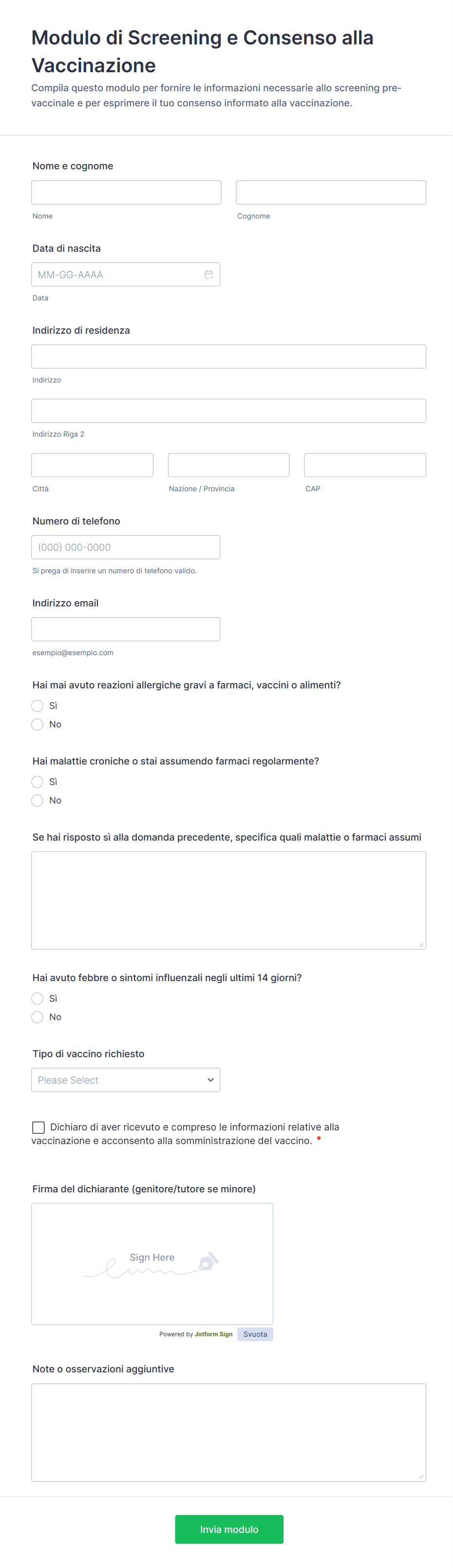 Tipicamente, il paziente firma il modulo. Per i minori o le persone incapaci di dare il consenso, deve firmare un genitore, tutore legale o rappresentante autorizzato.