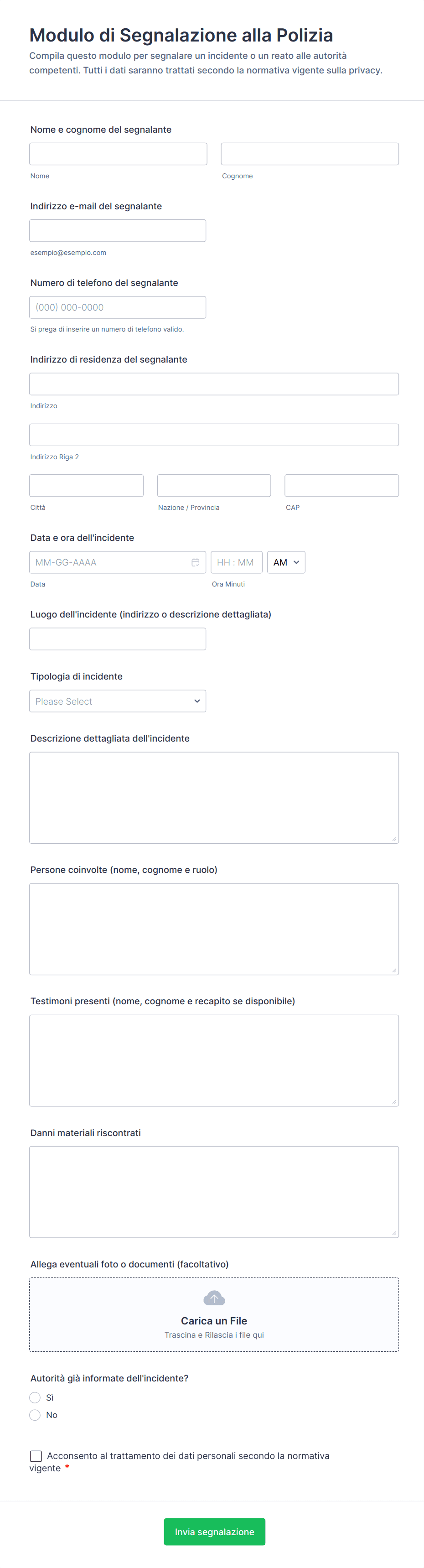Un modulo di segnalazione incidenti è un documento strutturato utilizzato per registrare i dettagli su eventi inaspettati, incidenti o quasi incidenti in vari contesti. Aiuta le organizzazioni a documentare cosa è successo, chi è stato coinvolto e quali azioni sono state intraprese.
