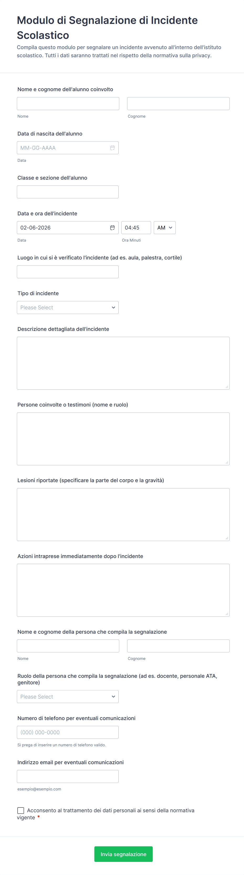 Un modulo di segnalazione incidenti è un documento strutturato utilizzato per registrare i dettagli su eventi inaspettati, incidenti o quasi incidenti in vari contesti. Aiuta le organizzazioni a documentare cosa è successo, chi è stato coinvolto e quali azioni sono state intraprese.