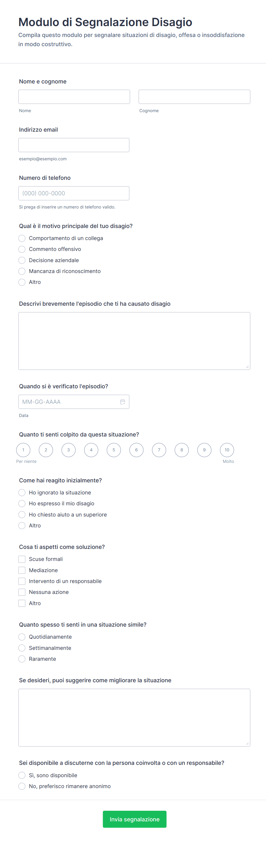 Campi tipici includono i dettagli di contatto del denunciante, la data e l'ora dell'incidente, una descrizione dettagliata del problema, la documentazione pertinente e la risoluzione preferita.