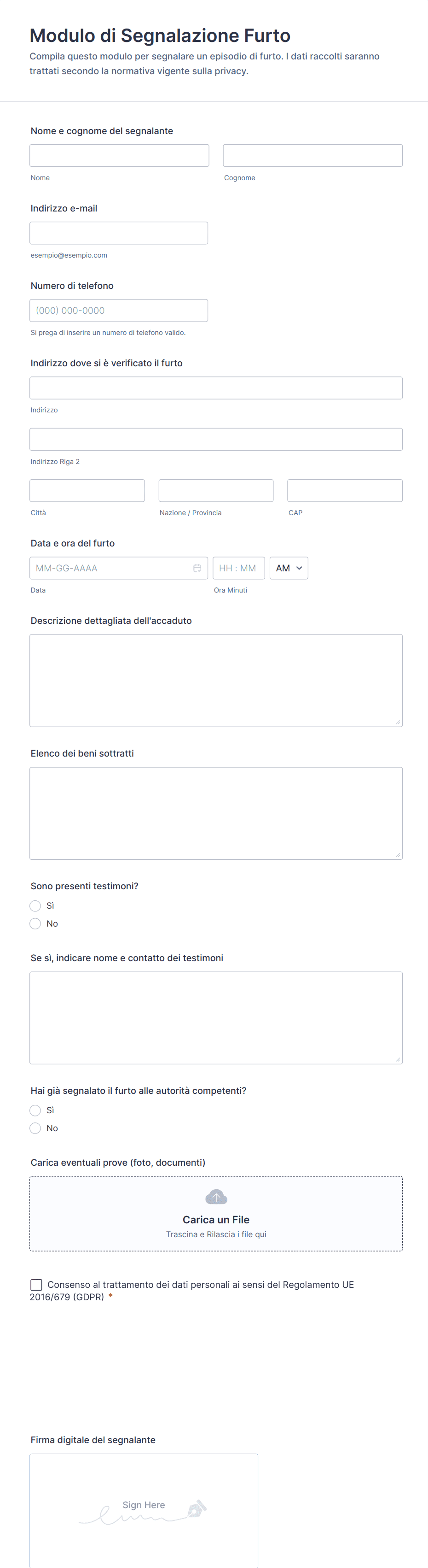 Un modulo di segnalazione incidenti è un documento strutturato utilizzato per registrare i dettagli su eventi inaspettati, incidenti o quasi incidenti in vari contesti. Aiuta le organizzazioni a documentare cosa è successo, chi è stato coinvolto e quali azioni sono state intraprese.
