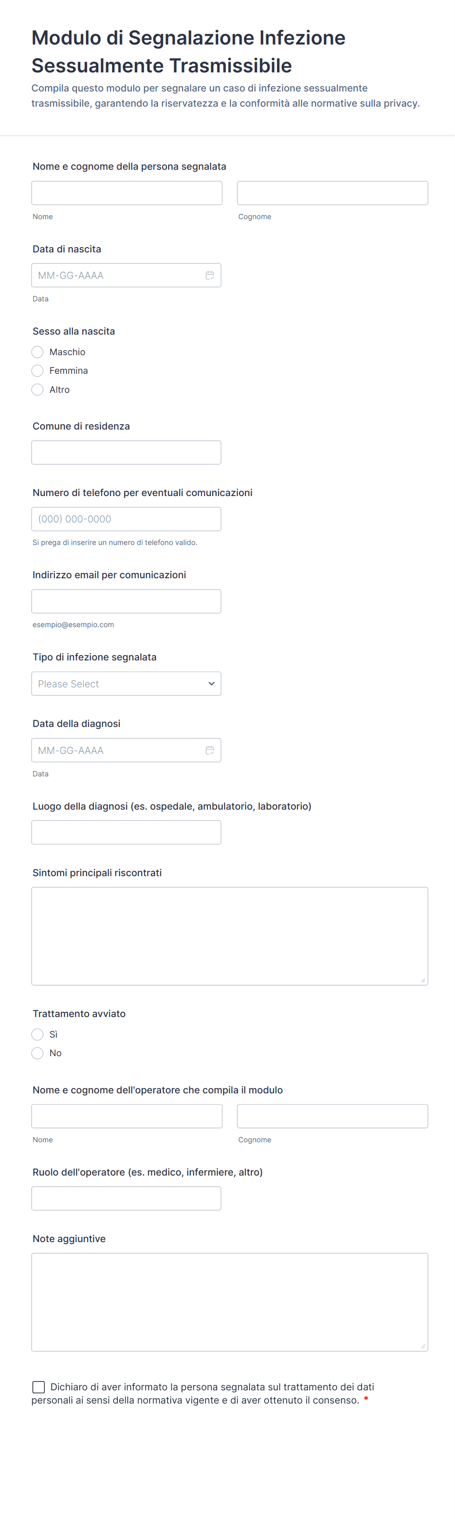 Esistono molti tipi diversi di moduli per il settore sanitario che coprono qualsiasi esigenza, dall'assicurazione all'anamnesi, alla dimissione. I principali tipi di moduli sanitari sono moduli di telemedicina, moduli di registrazione dei pazienti, moduli per farmacie, moduli per hospice, moduli di dimissione ospedaliera e indagini mediche. Possono coprire anche argomenti come il consenso informato, le prescrizioni, le richieste di indennizzo assicurativo e le segnalazioni.