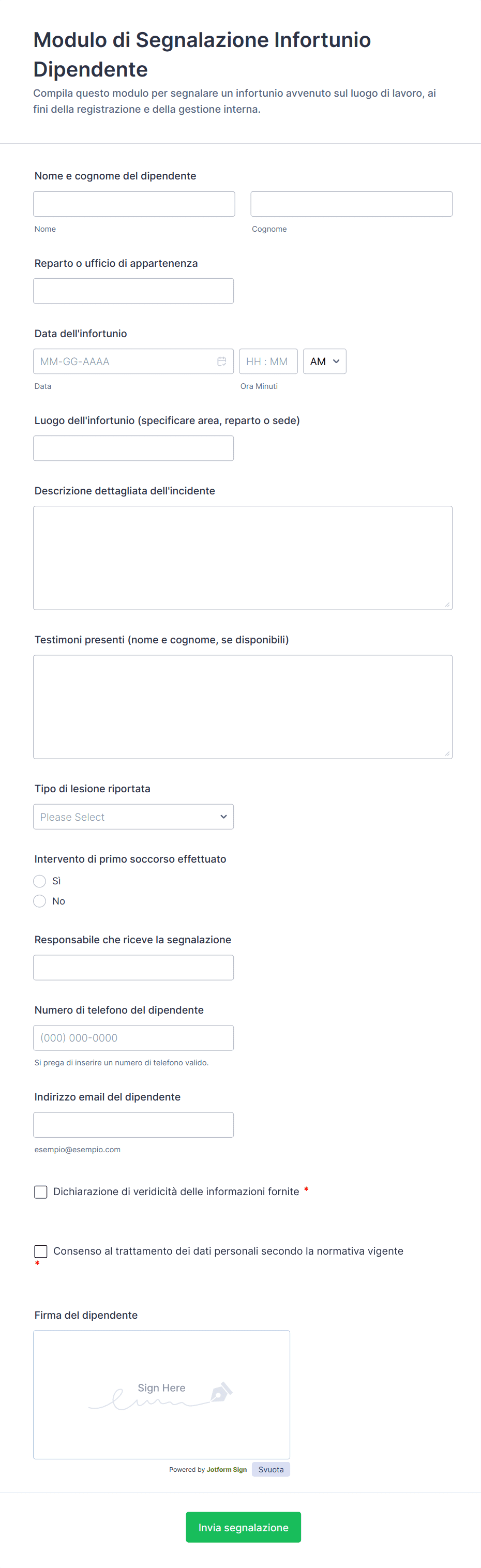 - Per le segnalazioni degli infortuni, includere campi per le cure mediche fornite e la gravità dell'infortunio.