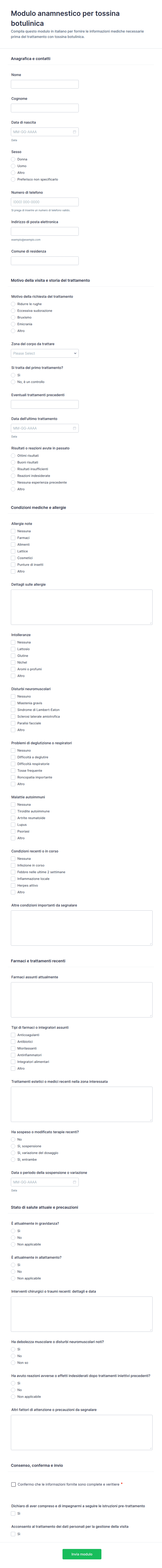 La tossina botulinica (più comunemente nota come "botox") è un farmaco cosmetico utilizzato per ridurre temporaneamente le rughe e le pieghe del viso. Se il tuo salone o clinica offre iniezioni di botox, fai registrare i clienti e programmati per i loro appuntamenti con i nostri modelli di moduli di Botox gratuiti. Seleziona semplicemente il modello già pronto più adatto alle tue esigenze, utilizza il nostro Form Builder per personalizzarlo per la tua clinica e incorporalo nel tuo sito Web o invialo direttamente ai clienti per iniziare a raccogliere le risposte.
