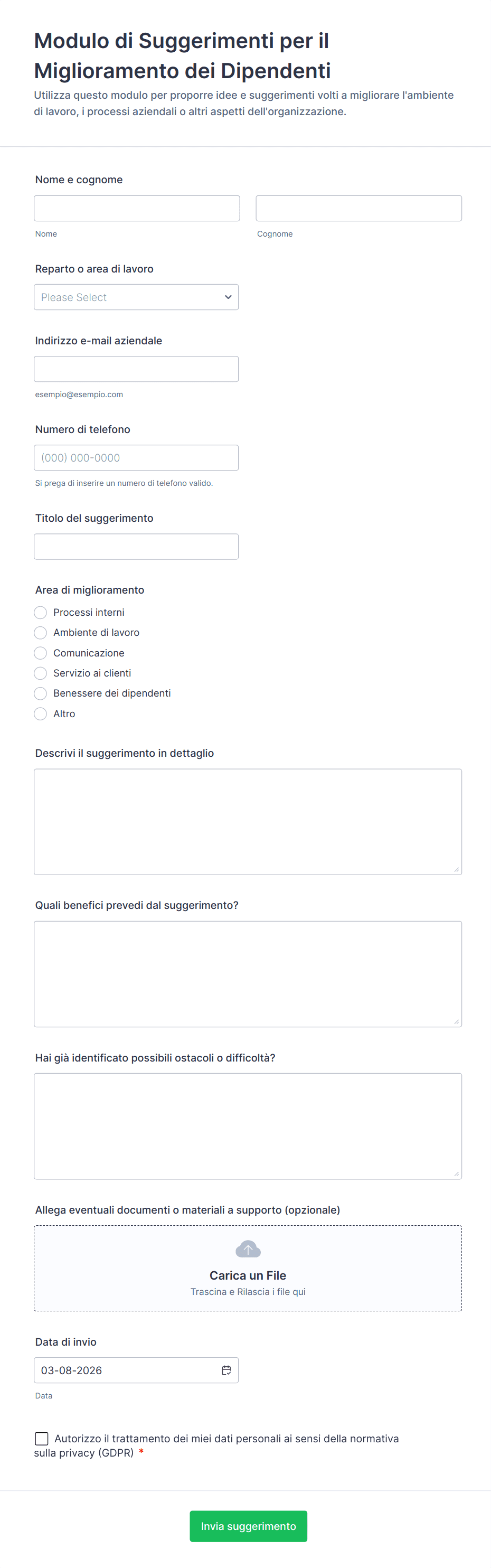 - Valutazioni delle prestazioni: Possono richiedere scale di valutazione, feedback aperto e campi di autovalutazione.