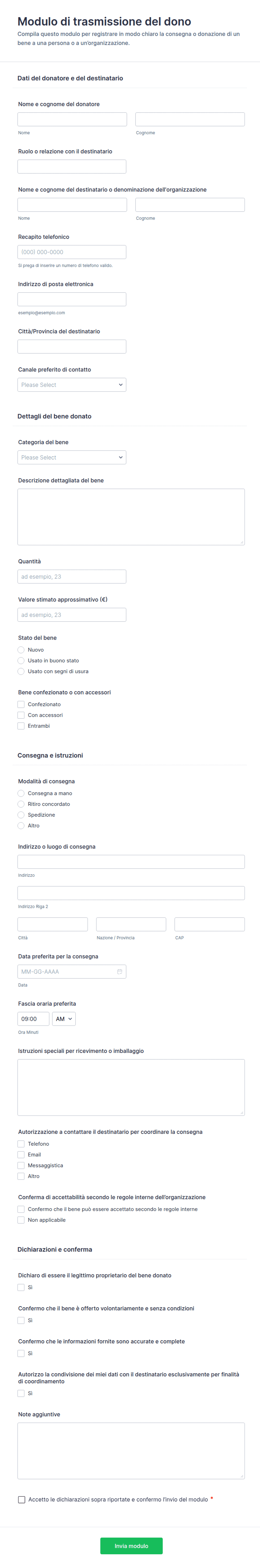 - Moduli per Donazioni Generiche: si concentrano sui dati del donatore, sull'importo della donazione e sul metodo di pagamento.
